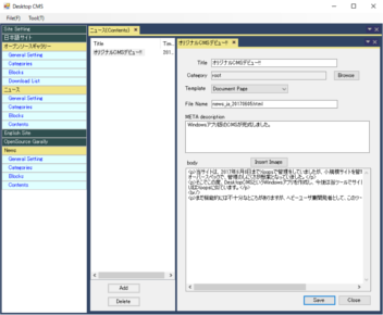 そこでこの度、DesktopCMSというWindowsアプリを作成し、今後は当ツールでサイトを生成することにいたしました。 UIと機能は概ねXoopsに似ています。